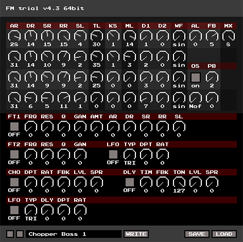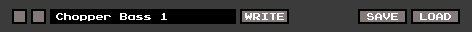 音色名の左側にあるボタンは音色を一つづつ進めたり戻したりするボタン。 「WRITE」ボタンを押すと、現在エディットしている音色をメモリに書き込めます。 「SAVE」ボタンを押すと、MyDocumentフォルダにパッチをセーブします。 「LOAD」ボタンを押すと、MyDocumentフォルダ内にあるパッチをロードします。