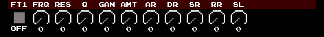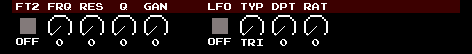| FT1 | フィルターセレクタ | OFF LPS2 LPS4 HPSS BPSS NTCH LSLF HSLF PEEK | フィルターOFF ローパスフィルター1 ローパスフィルター2(moogtype) ハイパスフィルター バンドパスフィルター ノッチフィルター ローシェルフフィルター ハイシェルフフィルター ピークフィルター |